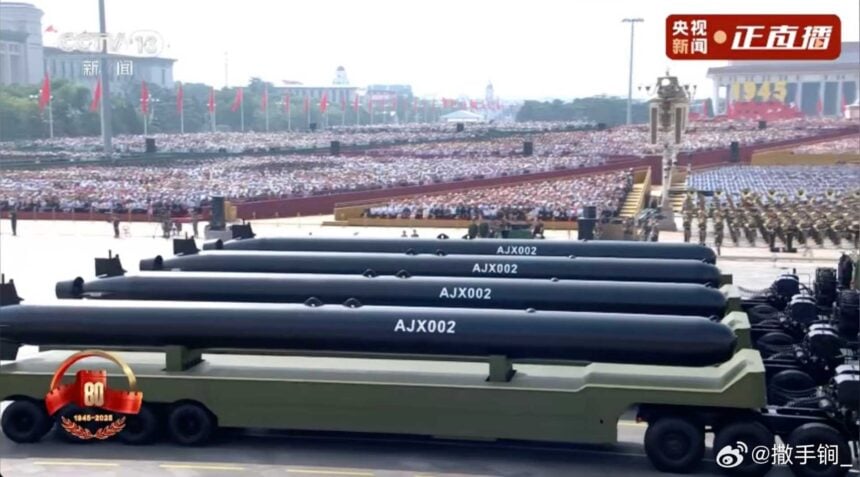 También debutó en el desfile el vehículo submarino no tripulado extragrande (XLUUV) AJX002. Tiene una longitud aproximada de 18 a 20 m y un diámetro de 1 a 1,5 m, con forma de torpedo y propulsión por chorro de aire.