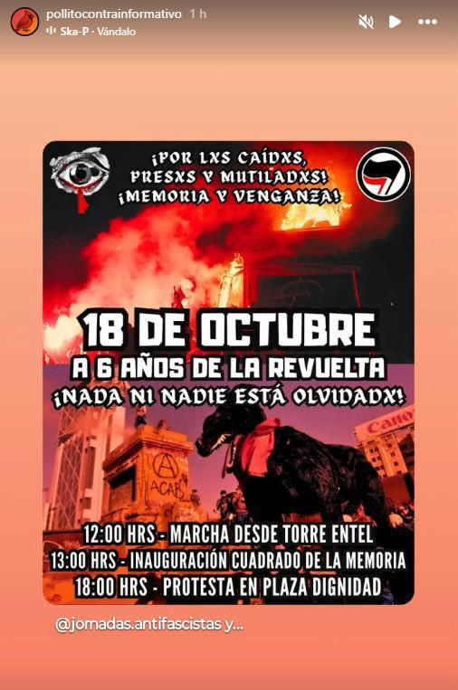 Así, al mediodía está prevista la llamada «Marcha Memoria y Venganza» desde la Torre Entel para, a las 13 horas, proceder a la inauguración del «Cuadrado de la Memoria» ubicado en el Parque Forestal, a pasos de Plaza Baquedano.