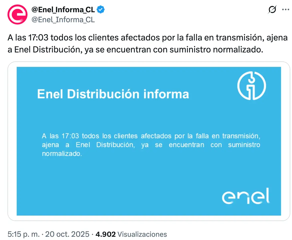 «A las 17:03 todos los clientes afectados por la falla en transmisión, ajena a Enel Distribución, ya se encuentran con suministro normalizado», posteó la empresa eléctrica.