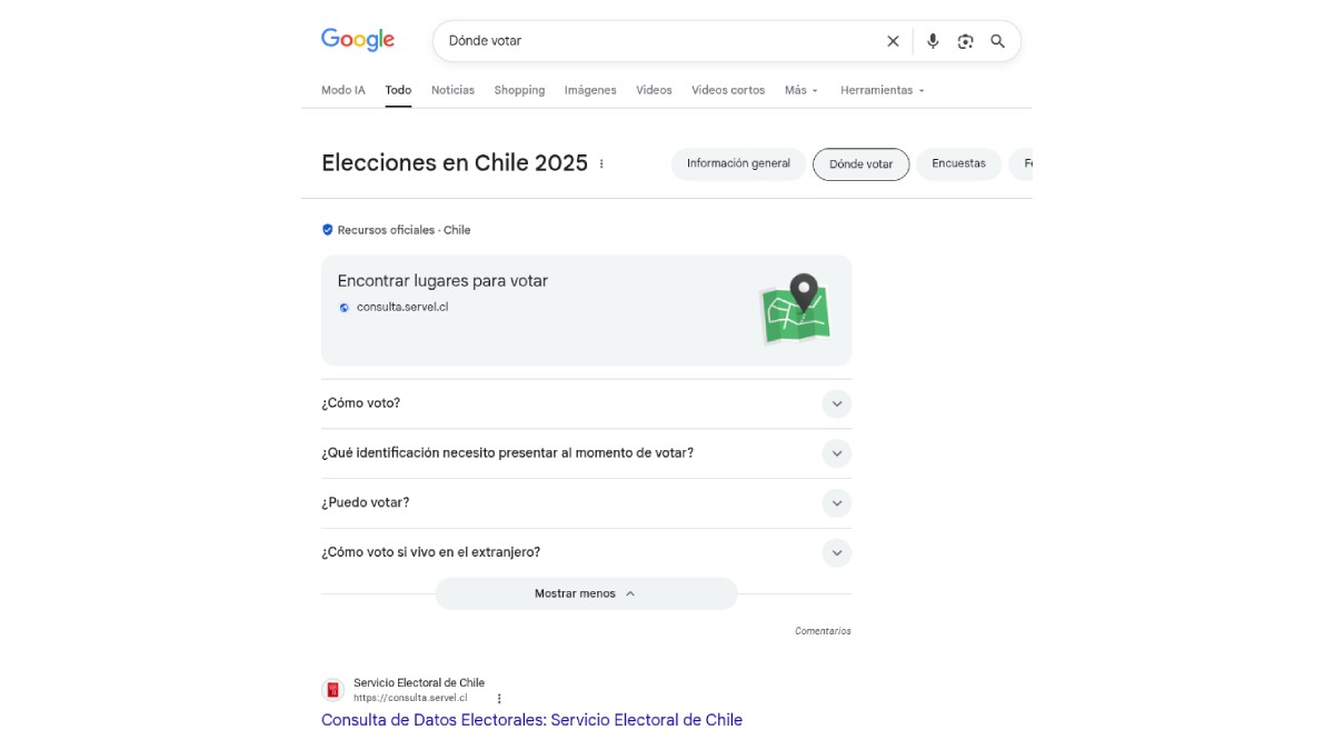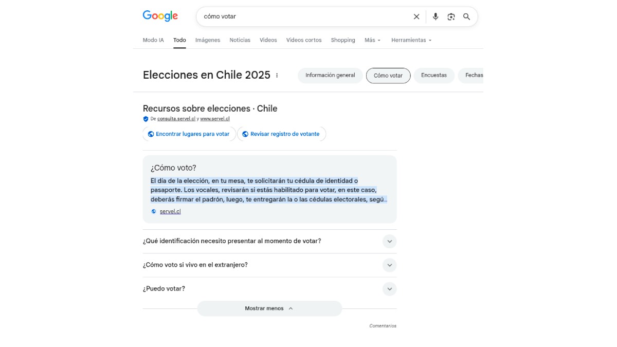 El Buscador de Google muestra información de alta calidad y confiable, así cuando las personas hagan búsquedas sobre “¿cómo votar?”, encontrarán información oficial sobre los requisitos de identificación, los recintos electorales y mucho más en el sitio web del Servel. Además, disponen de enlaces al sitio web de dicha entidad.