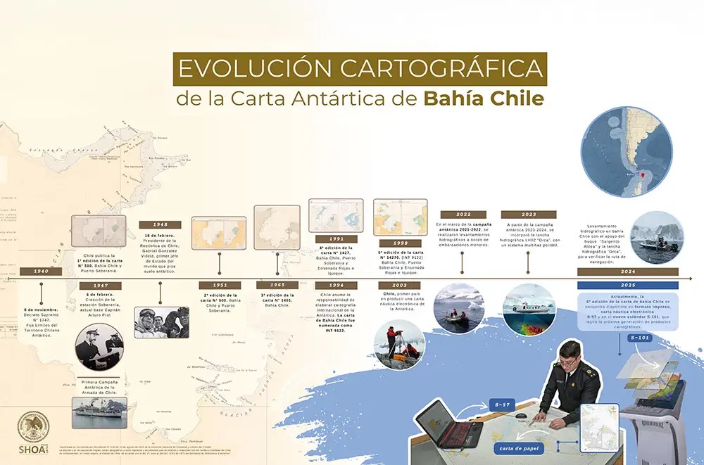 En el 2024, el SHOA amplió su cobertura, demostrando la capacidad del país para misiones complejas en el Territorio Chileno Antártico. Con esos datos, el Servicio preparó la sexta edición de la carta SHOA N° 14231 (INT 9122) “Bahía Chile, Puerto Soberanía, Ensenadas Rojas e Iquique”, tanto en papel como en sus formatos electrónicos S-57 y en el nuevo estándar S-101. Una triple producción que asegura continuidad para los usuarios actuales mientras se habilita una transición progresiva y ordenada hacia la nueva generación de cartografía náutica digital.