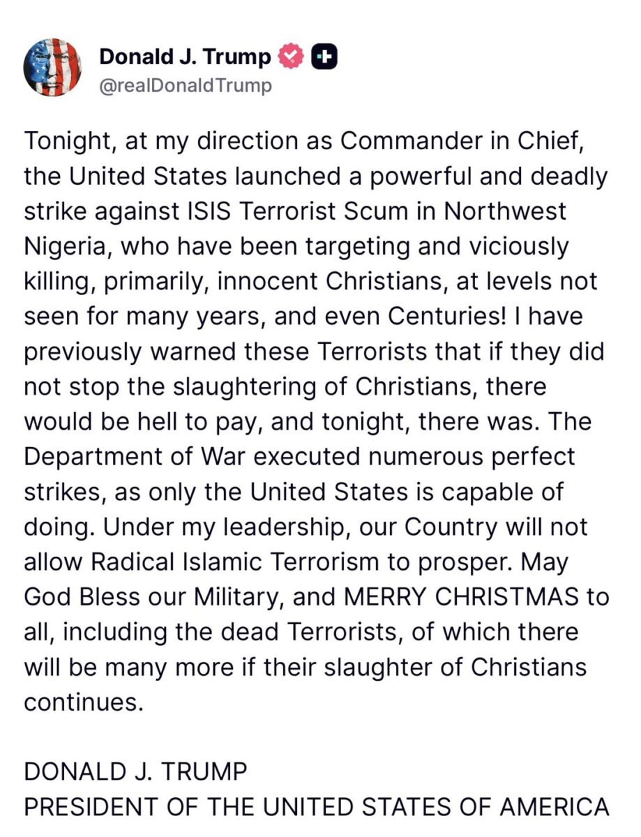 «Esta noche, bajo mi dirección como Comandante en Jefe, Estados Unidos lanzó un poderoso y letal ataque contra la escoria terrorista de ISIS en el noroeste de Nigeria, que ha estado atacando y asesinando brutalmente, principalmente, a cristianos inocentes, a niveles nunca vistos en muchos años, ¡e incluso siglos! Previamente les advertí a estos terroristas que si no detenían la masacre de cristianos, se desataría un infierno, y esta noche lo hubo. El Departamento de Guerra ejecutó numerosos ataques perfectos, como solo Estados Unidos es capaz de hacer. Bajo mi liderazgo, nuestro país no permitirá que prospere el terrorismo islámico radical. Que Dios bendiga a nuestras Fuerzas Armadas y les deseo una FELIZ NAVIDAD a todos, incluidos los terroristas muertos, que serán muchos más si continúa su masacre de cristianos. DONALD J. TRUMP PRESIDENTE DE LOS ESTADOS UNIDOS DE AMÉRICA».