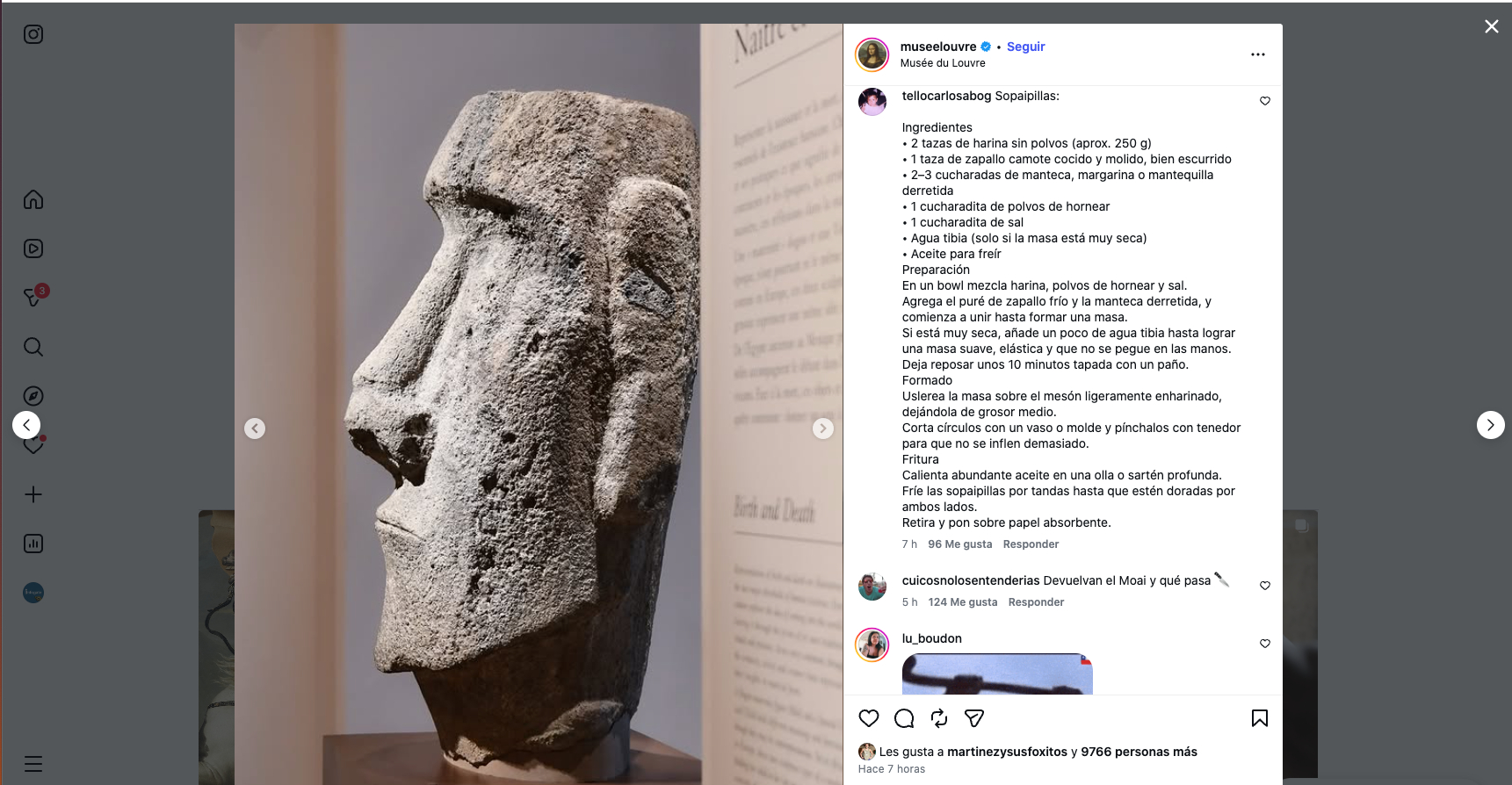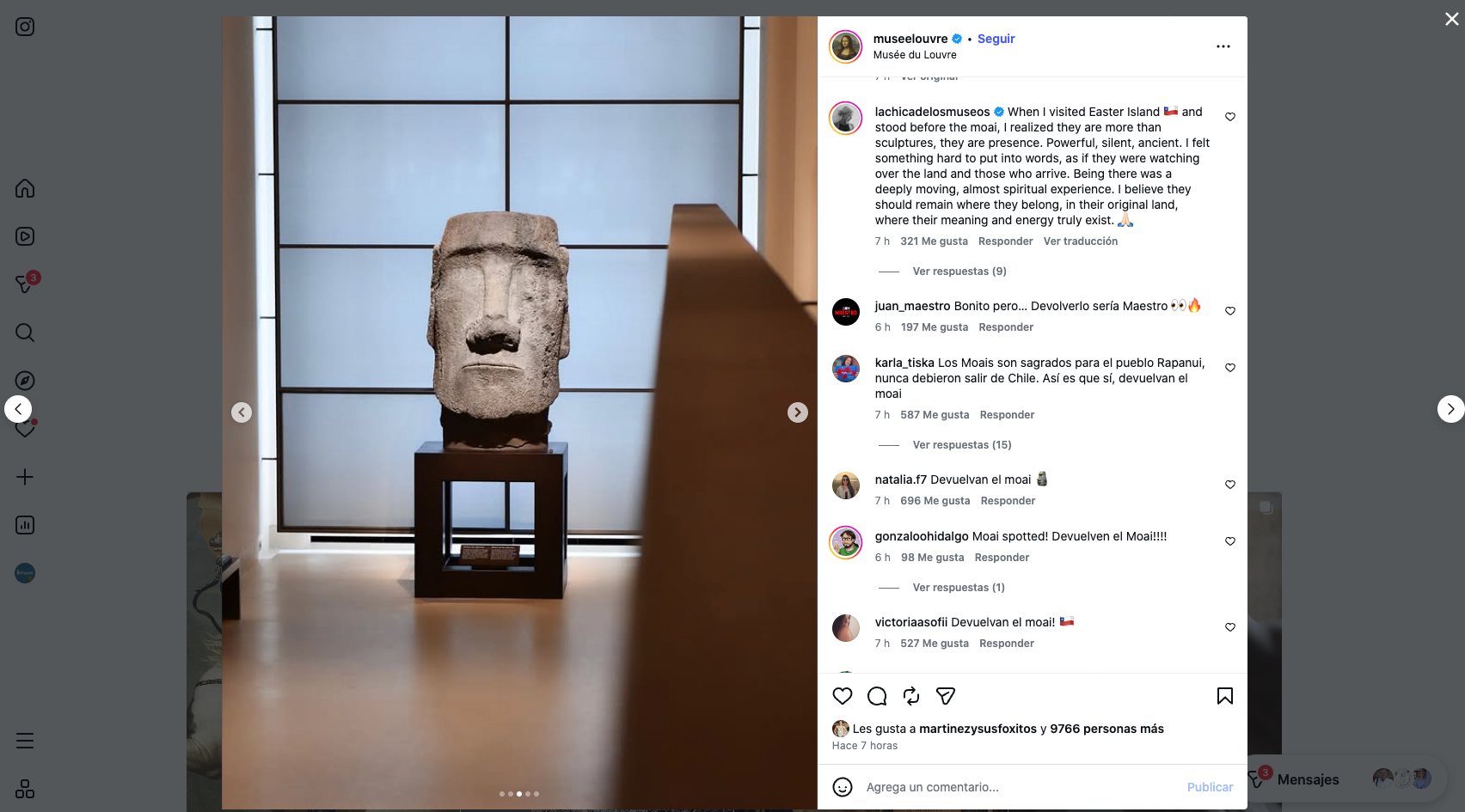 Un post de la cuenta de instagram del Louvre mostrando la cabeza del Moai encendió las redes sociales con miles de comentarios de chilenos y extranjeros reclamando la «devolución del Moai» a Isla de Pascua, además de «mensajes de funas» como lo ocurrido con el vocalista de Maroon Five (Adam Levine) criticando su pasada por el Festival de Viña, publicando en su cuenta recetas típicas de recetas chilenas.