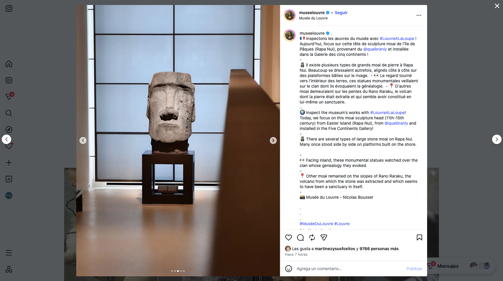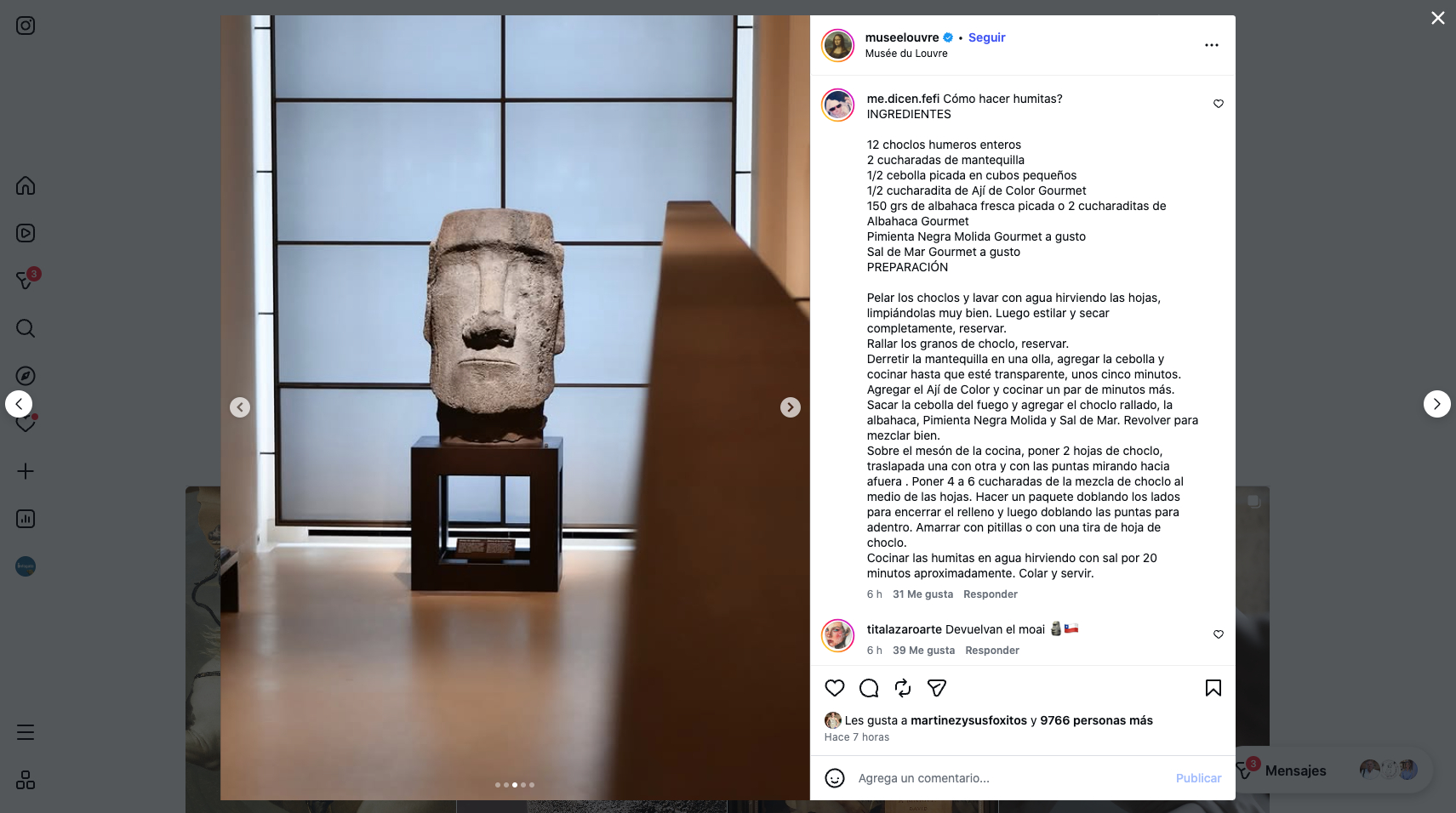 Un post de la cuenta de instagram del Louvre mostrando la cabeza del Moai encendió las redes sociales con miles de comentarios de chilenos y extranjeros reclamando la «devolución del Moai» a Isla de Pascua, además de «mensajes de funas» como lo ocurrido con el vocalista de Maroon Five (Adam Levine) criticando su pasada por el Festival de Viña, publicando en su cuenta recetas típicas de recetas chilenas.