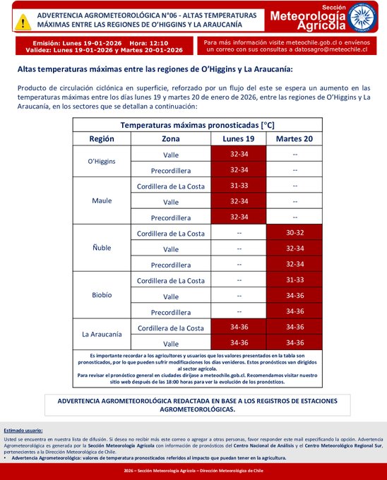 La Dirección Meteorológica (DMC) emitió una nueva advertencia agrometeorológica por altas temperaturas que afectarán entre las regiones de O´Higgins y La Araucanía.