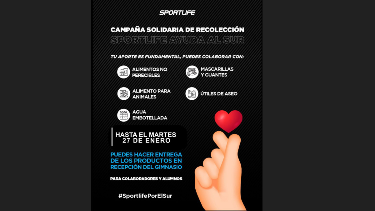 Frente a la compleja situación que afecta a distintas localidades del sur del país, Sportlife decidió hacer el lanzamiento de una campaña solidaria “Sportlife por el Sur”. La iniciativa busca ir en ayuda de las personas damnificadas, movilizando a su comunidad de colaboradores y alumnos a lo largo de Chile.