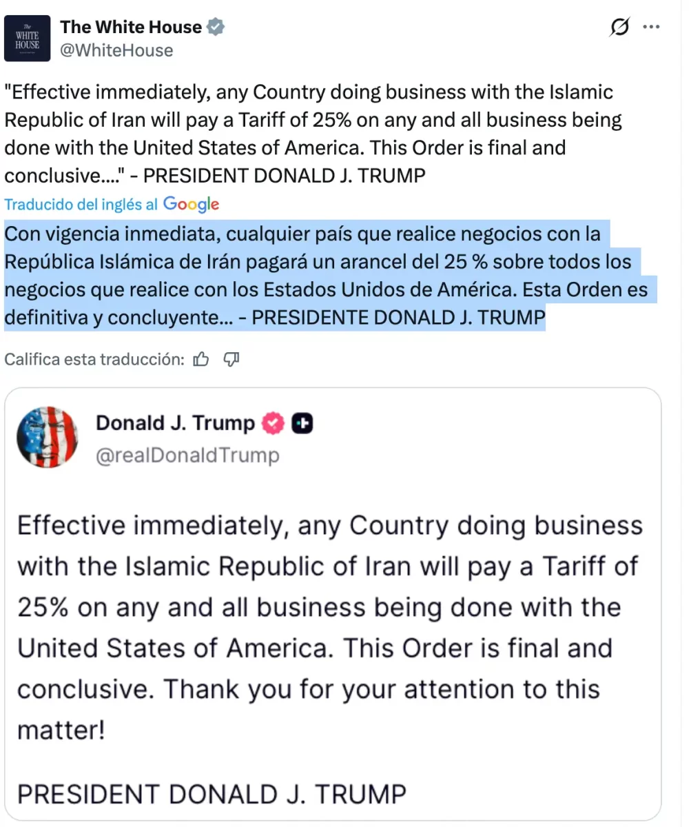 «Con vigencia inmediata, cualquier país que realice negocios con la República Islámica de Irán pagará un arancel del 25 % sobre todos los negocios que realice con los Estados Unidos de América. Esta Orden es definitiva y concluyente... – PRESIDENTE DONALD J. TRUMP», este es el mensaje oficial que ha publicado el mandatario de EEUU en su red social este lunes con el fin de presionar al régimen persa sumido en protestas.