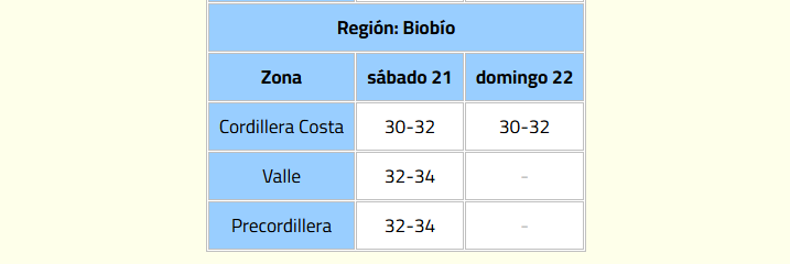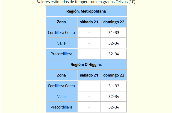 Las regiones donde se sentirán las altas temperaturas son la Metropolitana, O’Higgins, Maule, Ñuble y Biobío.
