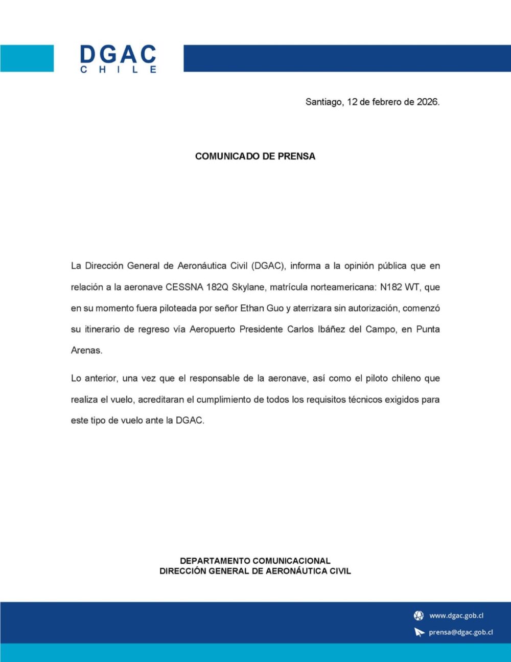 La nave piloteada por Ethan Guo, aterrizó «sin autorización, comenzó su itinerario de regreso vía Aeropuerto Presidente Carlos Ibáñez del Campo, en Punta Arenas”.