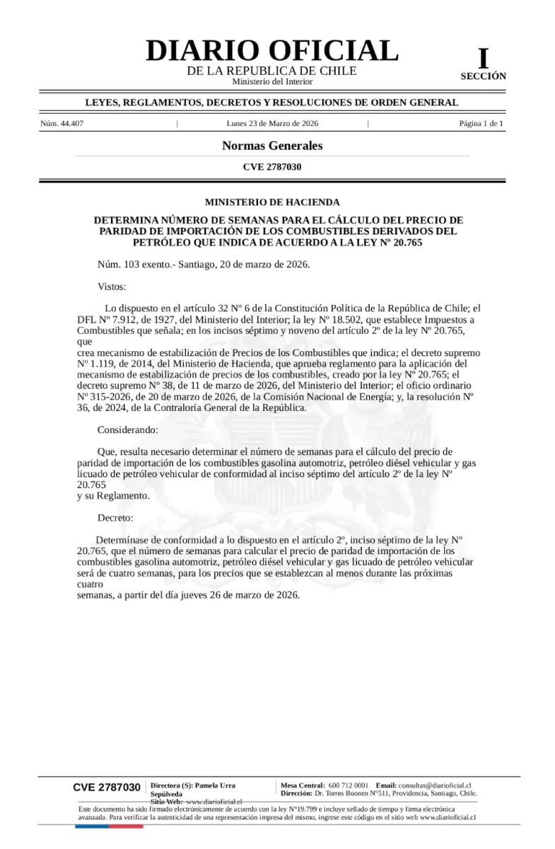 Este lunes en el Diario Oficial el Ministerio de Hacienda publica el «Decreto exento número 103, de 2026.- Determina número de semanas para el cálculo del precio de paridad de importación de los combustibles derivados del petróleo que indica de acuerdo a la ley Nº 20.765».