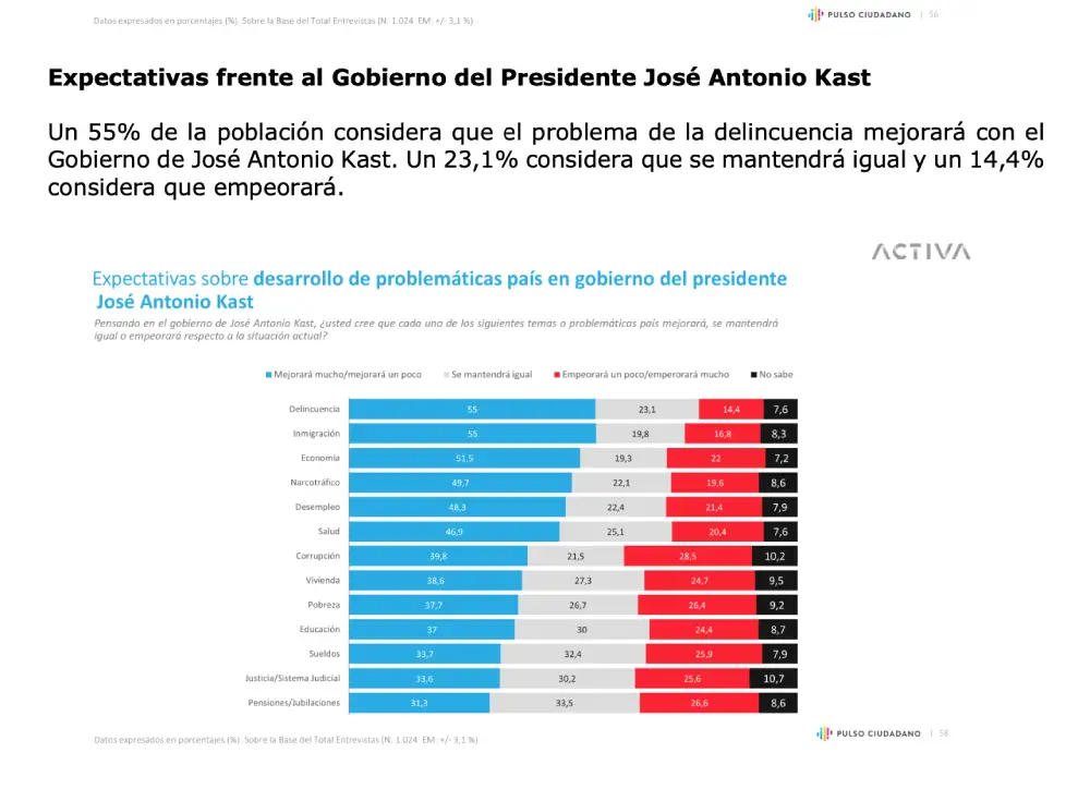 Un 55% de la población considera que el problema de la delincuencia mejorará con el Gobierno de José Antonio Kast. Un 23,1% considera que se mantendrá igual y un 14,4% considera que empeorará.