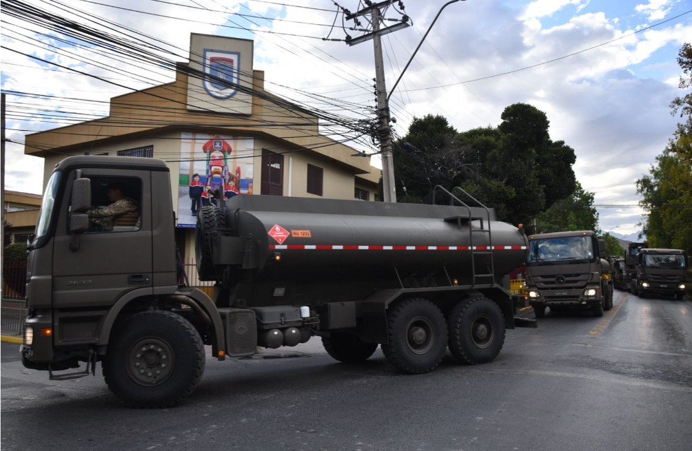 El desplazamiento se realiza mediante dos columnas motorizadas: una destinada al traslado del personal en buses y otra integrada por camiones que transportan maquinaria de ingenieros, entre ellas excavadoras, retrocargadores, bulldozer, camiones tolvas y cargadores frontales, equipos que serán utilizados en las faenas diarias.