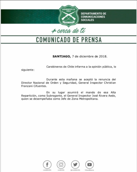 La confirmación fue hecha por la propia institución que a través de un comunicado de prensa señala que «durante esta mañana se aceptó la renuncia del Director Nacional de Orden y Seguridad, General Inspector Christian Franzani Cifuentes«.