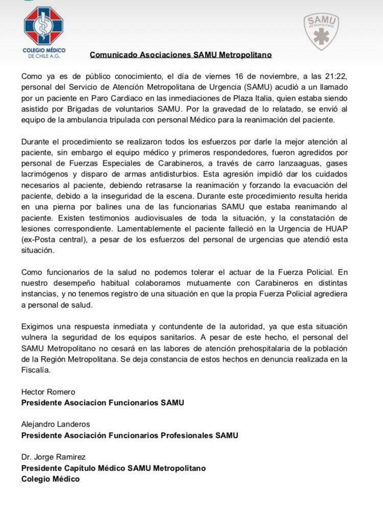 La Asociación de SAMU Metropolitano acusó este sábado a Carabineros de impedir la normal atención a una persona lesionada durante las manifestaciones de la última jornada en Plaza Italia, quien falleció posteriormente, debido a la agresión que sufrieron los paramédicos que atendían a la persona afectada.