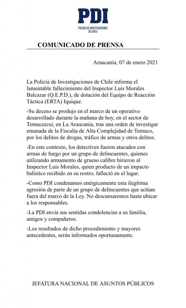 Al respecto, y poco antes de embarcarse junto al director general de la PDI, Héctor Espinosa, rumbo a La Araucanía, el subsecretario del Interior, Juan Francisco Galli, señaló que “hoy falleció un funcionario de la PDI cumpliendo una orden judicial de allanamiento por presencia de drogas y armamentos. Ese PDI fue asesinado por personas que ocuparon armas de fuego para oponerse a la acción de la justicia”, dijo.