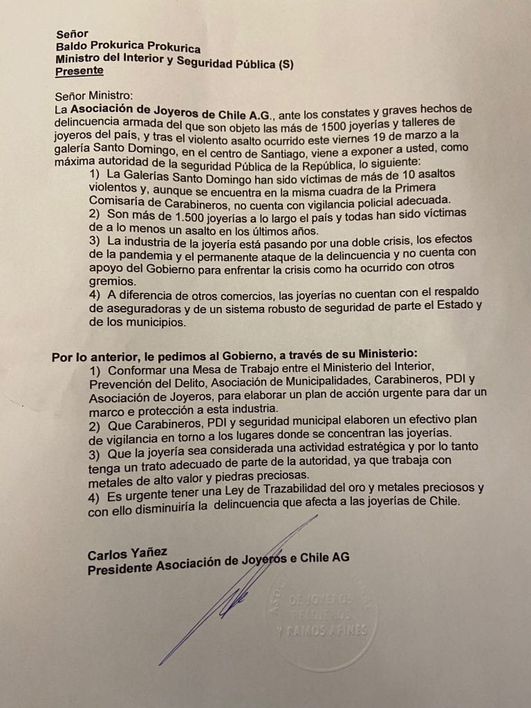 Entre otras solicitudes que los joyeros entregaron al Gobierno, según explicó Carlos Yáñez, presidente del gremio, se cuentan la conformación de planes de seguridad de Carabineros, PDI y municipios, y la dictación de una Ley de Trazabilidad del oro y metales preciosos para disminuir la delincuencia que afecta al sector.